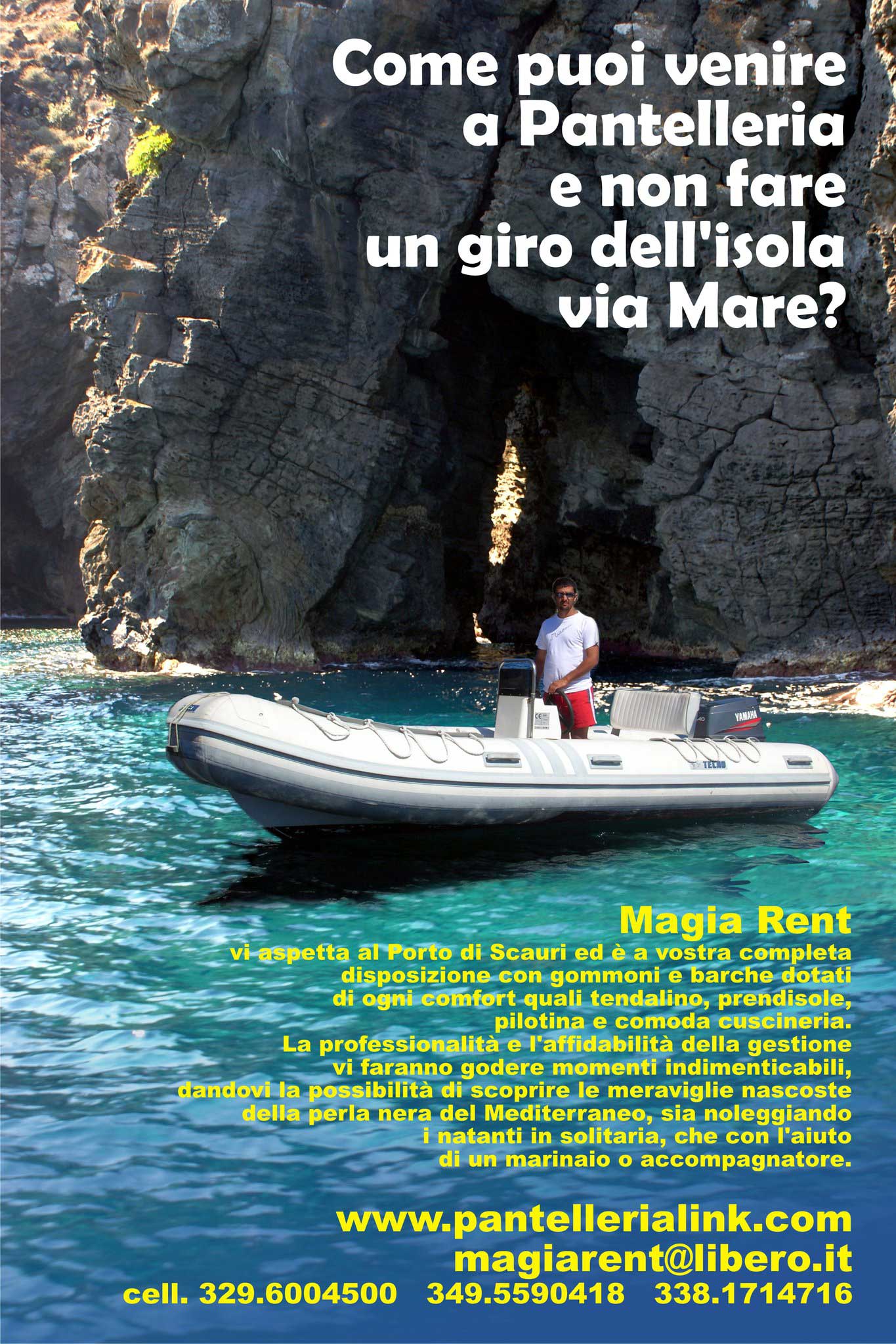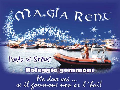 Magia Rent vi aspetta al porto di Scauri ed è a vostra completa disposizione con gommoni e barche dotati di ogni comfort: tendalino, prendisole, pilotina, doccetta con acqua dolce, comoda cucineria e borse frigo. La professionalità e l'affidabilità della gestione vi faranno godere momenti indimenticabili, dandovi la possibilità di scoprire le meraviglie nascoste della Perla Nera del mediterraneo, sia noleggiando i natanti in solitaria, che con l'aiuto di un esperto marinaio o di un accompagnatore.